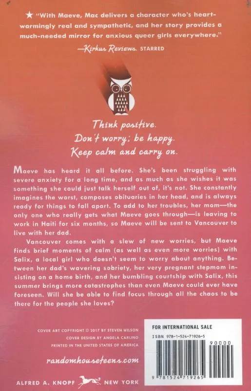 Perfect for fans of Finding Audrey and Everything, Everything, this is the poignant and uplifting story of Maeve, who is dealing with anxiety while falling in love with a girl who is not afraid of anything. Think positive. Don’t worry; be happy. Keep calm and carry on. Maeve has heard it all before. She’s been struggling with severe anxiety for a long time, and as much as she wishes it was something she could just talk herself out of, it’s not. She constantly imagines the worst, composes obituaries in her head, and is always ready for things to fall apart. To add to her troubles, her mom-the only one who really gets what Maeve goes through-is leaving for six months, so Maeve will be sent to live with her dad in Vancouver. Vancouver brings a slew of new worries, but Maeve finds brief moments of calm (as well as even more worries) with Salix, a local girl who doesn’t seem to worry about anything. Between her dad’s wavering sobriety, her very pregnant stepmom insisting on a home birth, and her bumbling courtship with Salix, this summer brings more catastrophes than even Maeve could have foreseen. Will she be able to navigate through all the chaos to be there for the people she loves? “With Maeve,