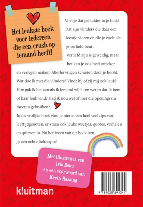 Voel je dat gefladder in je buik? Dat zijn vlinders die daar een feestje vieren en die je voelt als je verliefd bent.Verliefd zijn is geweldig, maar het kan je ook heel onzeker en verlegen maken. Allerlei vragen schieten door je hoofd.Wat doe ik met die vlinders? Vindt hij of zij mij ook leuk? Hoe pak ik het aan als ik iemand wil laten weten dat ik hemof haar leuk vind? Had ik nou wel of niet die openingszin moeten gebruiken?In dit vrolijke boek vind je niet alleen heel veel tips van leeftijdgenoten, er staan ook leuke weetjes, quotes, verhalenen quizzen in. Na het lezen van dit boek ben jij een echte liefdespro!