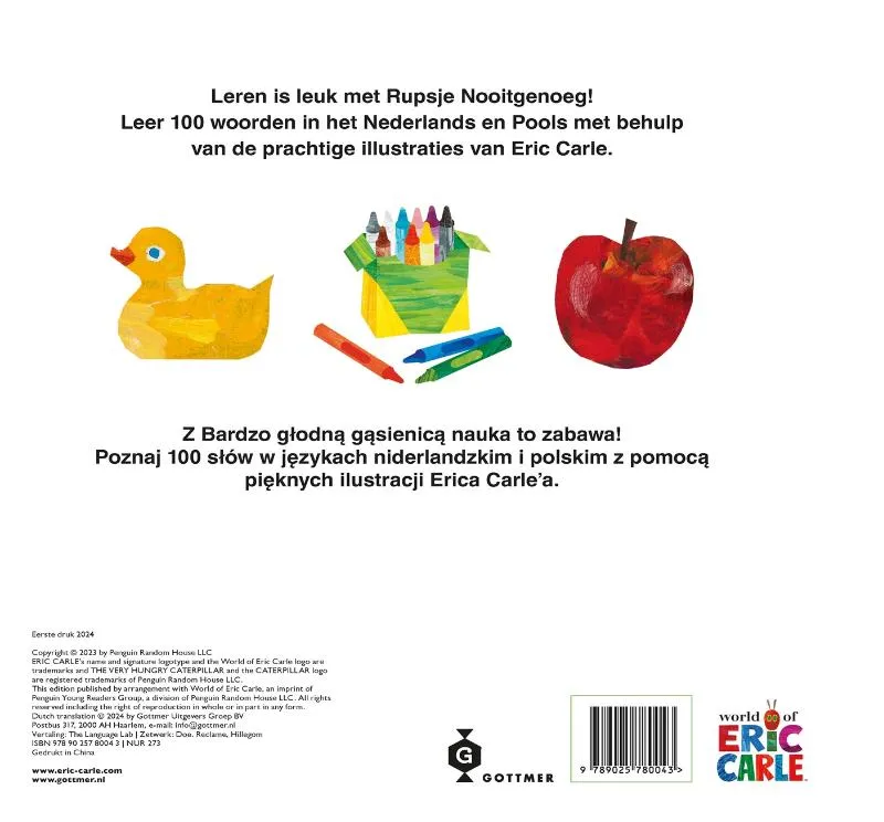 Poolssprekende lezers en voorlezers kunnen ook genieten van het geliefde kinderboekenkarakter Rupsje Nooitgenoeg, dankzij het tweetalige boekje: ‘Rupsje Nooitgenoeg – 100 eerste woordjes / Pierwszych slów’. Deze bijzondere tweetalige kartonboekjes zijn ook verkrijgbaar in het Nederlands-Turks, Nederlands-Arabisch en Nederlands-Engels.<br><br>De taalvarianten zijn perfect voor nieuwsgierige peuters om zowel in hun moedertaal als in het Nederlands nieuwe woorden te leren. De herkenbare illustraties van Eric Carle brengen op een treffende manier de betekenis van elk woord tot leven. Het voorlezen in meerdere talen geeft ruimte aan en erkent de eigen taal, terwijl zowel voorlezer als kind tegelijkertijd het Nederlandse woord leren. Ontdek de magie van Rupsje Nooitgenoeg in verschillende talen en stimuleer de taalontwikkeling van jouw kleintje op een speelse manier!<br><br>Rupsje Nooitgenoeg, het meest iconische karakter van auteur en illustrator Eric Carle, heeft een speciaal plekje veroverd in de harten van jong en oud. Ondanks dat het gelijknamige prentenboek al meer dan 50 jaar geleden werd uitgebracht, blijft het een tijdloze favoriet. En dat is niet zonder reden: de heldere collage-illustraties en het vrolijke verhaal maken het nog steeds een waar genot om te lezen. Geschikt voor kinderen vanaf 2 jaar, is Rupsje Nooitgenoeg een onmisbaar onderdeel van elke boekenkast. Ontdek de magie van dit geliefde personage en beleef samen met je kleintje de wonderlijke avonturen van Rupsje Nooitgenoeg!