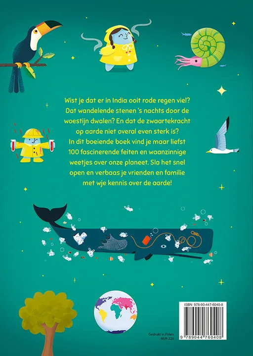Ben jij ook gefascineerd door onze wonderlijke planeet? In dit boeiende boek vind je maar liefst 100 fascinerende feiten en waanzinnige weetjes over de aarde. Wist je bijvoorbeeld dat er in India ooit rode regen viel? Dat wandelende stenen ’s nachts door de woestijn dwalen? Of dat de zwaartekracht op aarde niet overal even sterk is? Sla dit boek snel open en verbaas je vrienden en familie met je kennis! Boordevol kleurrijke infografische illustraties die de tekst verduidelijken.