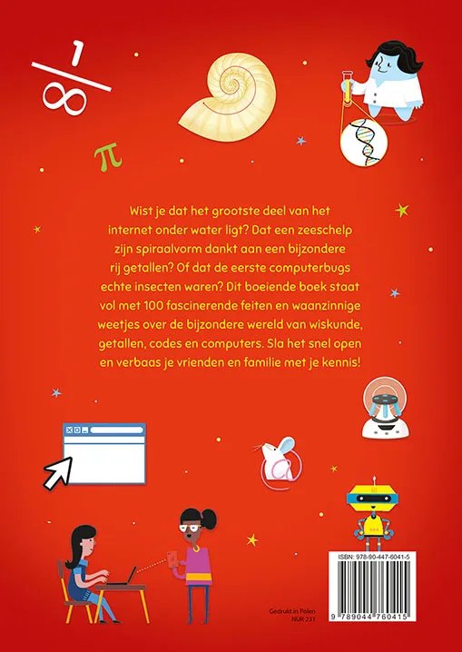 In dit boeiende boek vind je maar liefst 100 fascinerende feiten over de bijzondere wereld van wiskunde, computers, getallen en codes. Wist je bijvoorbeeld dat het grootste deel van het internet onder water ligt? Dat een zeeschelp zijn spiraalvorm dankt aan een bijzondere rij getallen? Of dat de eerste computerbugs echte insecten waren? Sla dit boek snel open en verbaas je vrienden en familie met je kennis! Boordevol kleurrijke infografische illustraties die de tekst verduidelijken.
