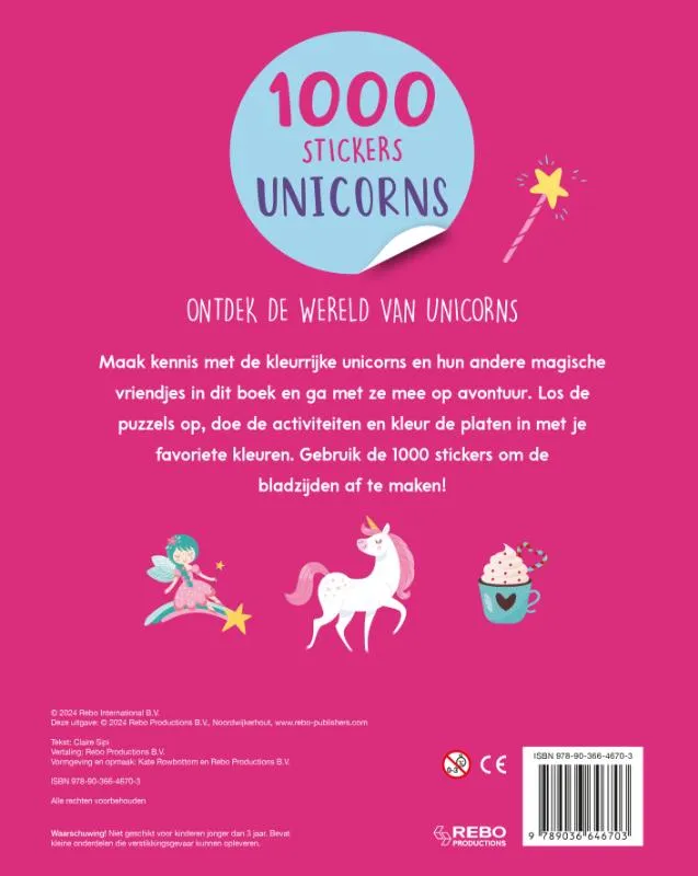 Ontdek de wereld van unicorns met dit boek vol puzzels om op te lossen, mooie afbeeldingen om in te kleuren en 1000 stickers om op te plakken.