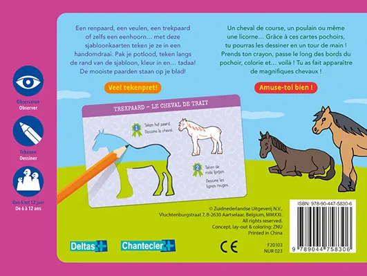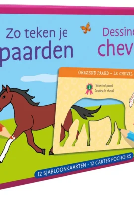 In deze handige doos zitten 12 sjablonen van paarden. Een renpaard, een veulen, een trekpaard of zelfs een eenhoorn… Pak je potlood, teken langs de rand van de sjabloon, kleur in en… tadaa! De mooiste paarden staan op je blad! Veel tekenpret!
