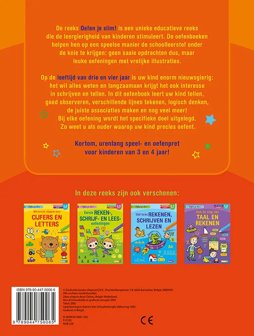 Op de leeftijd van drie en vier jaar is uw kind enorm nieuwsgierig: het wil alles weten en langzaamaan krijgt het ook interesse in schrijven en tellen. In dit oefenboek leert uw kind tellen, goed observeren, verschillende lijnen tekenen, logisch denken, de juiste associaties maken en nog veel meer! Bij elke oefening wordt het specifieke doel uitgelegd. Zo weet u als ouder waarop uw kind precies oefent. Kortom, urenlang speel- en oefenpret voor kinderen van 3 en 4 jaar!