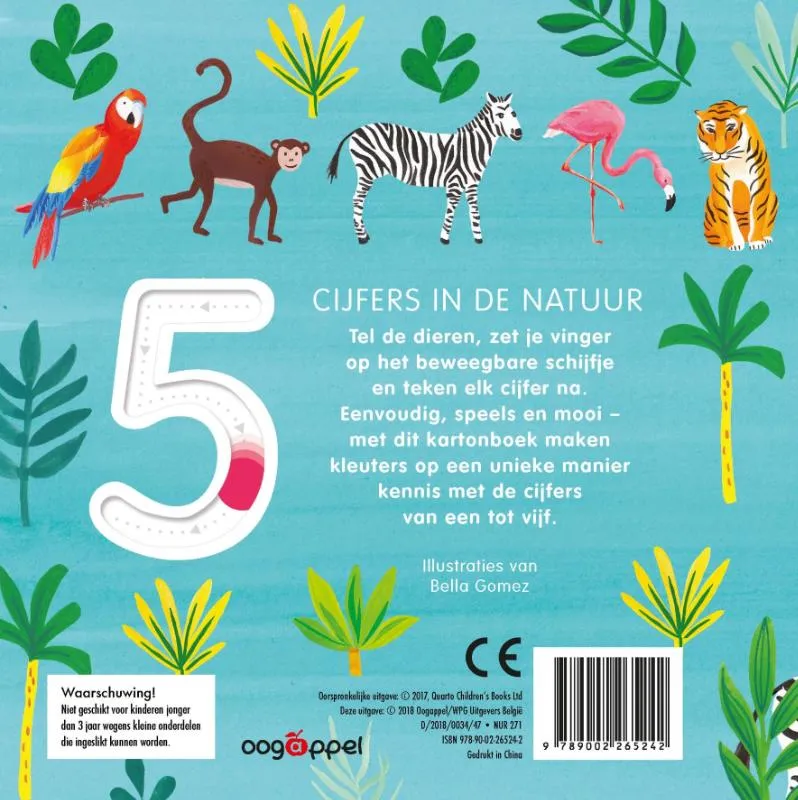 Tel de dieren, zet je vinger op het beweegbare schijfje en teken elk cijfer na. Eenvoudig, speels en mooi – met dit kartonboek maken kleuters op een unieke manier kennis met de cijfers van een tot vijf. Met illustraties van Bella Gomez.