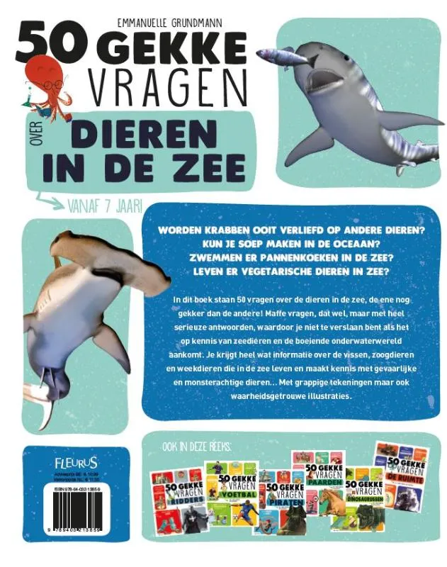 In dit boek staan 50 vragen over de dieren in de zee, de ene nog gekker dan de andere! Maffe vragen, dat wel, maar met heel serieuze antwoorden, waardoor je niet te verslaan bent als het op kennis van zeedieren en de boeiende onderwaterwereld aankomt. Je krijgt heel wat informatie over de vissen, zoogdieren en weekdieren die in de zee leven en maakt kennis met gevaarlijke en monsterachtige dieren… Met grappige tekeningen maar ook waarheidsgetrouwe illustraties.