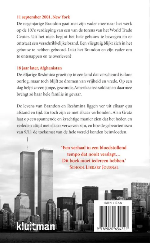 18 jaar later, Afghanistan. De elfjarige Reshmina groeit op in een land dat verscheurd is door oorlog, maar toch blijft ze dromen van vrijheid en vrede. Op een dag helpt ze een jonge, gewonde, Amerikaanse soldaat en daarmee brengt ze haar hele familie in gevaar. De levens van Brandon en Reshmina liggen ver uit elkaar qua afstand en tijd. En toch zijn ze met elkaar verbonden. Alan Gratz laat op een spannende en krachtige manier zien dat het heden en verleden altijd met elkaar verweven zijn, en hoe de gebeurtenissen van 9/11 de toekomst van de hele wereld konden beïnvloeden.