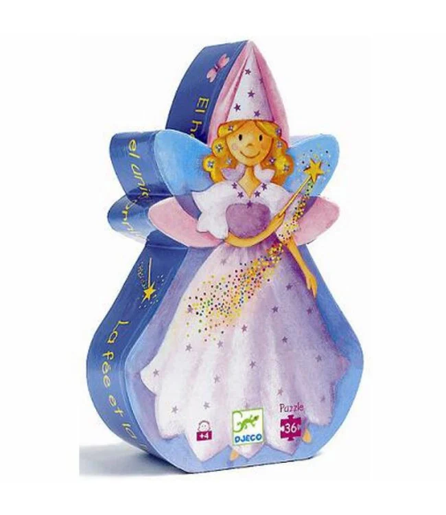 Als de fee een eenhoorn ontmoet in de glinsterende nacht. Een prachtige puzzel van 36 stukjes in een elegante doos in de vorm van een fee.