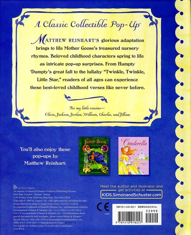 Matthew Reinhart’s paper engineering enhances classic Mother Goose nursery rhymes with six pop-up spreads and mini books, creating a timeless family keepsake.
