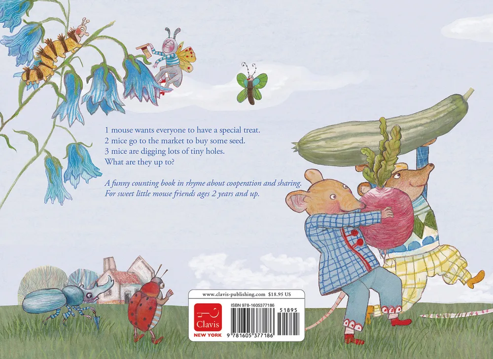Eén muisje wil zijn vrienden verrassen met een traktatie. Twee muisjes gaan naar de markt om zaadjes te kopen. En drie muisjes maken gaatjes in de grond. Ze komen tot stap tien. Wat zijn ze toch van plan? Oblong prentenboek met illustraties in natuurlijke kleuren en tekst op rijm. Vanaf ca. 3 jaar.