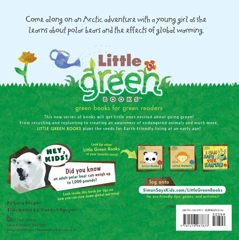 Come along on an Arctic adventure with a little girl and her father and learn all about polar bears! This 8 x 8 storybook shows how global warming affects two baby polar bear cubs and their family. Includes tips for kids on what they can do to help slow down global warming.