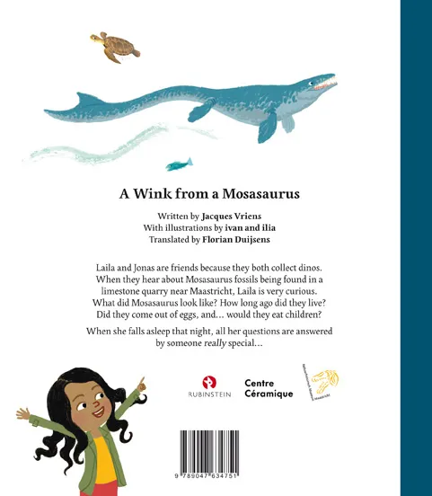 Laila and Jonas are friends because they both collect dinos. When they hear about Mosasaurus fossils being found in a limestone quarry near Maastricht, Laila is very curious. What did Mosasaurus look like? How long ago did they live? Did they come out of eggs, and… would they eat children? When she falls asleep that night, all her questions are answered by someone really special…