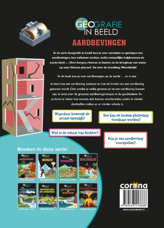 In dit boek lees je over aardbevingen, op de aarde … en in zee. Je leest hoe een aardbeving ontstaat en hoe de kracht van een aardbeving gemeten wordt. Ook ontdek je welke gevaren er ná een aardbeving kunnen zijn. Je leest over de grootste aardbevingsrampen in de geschiedenis. En je komt te weten hoe mensen zich kunnen voorbereiden, zodat er minder slachtoffers vallen en er minder schade is.