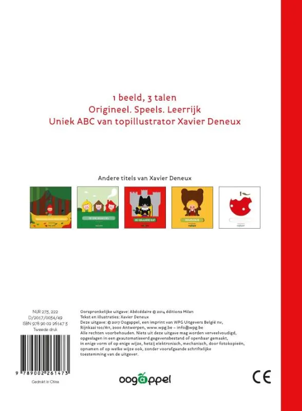 In dit lijvige, bijzonder mooi vormgegeven ABC-boek met hardkartonnen bladzijden en twee afgeronde hoeken heeft Xavier Deneux een alfabet aan afbeeldingen gemaakt. Hij maakt veel gebruik van strakke kleurvlakken en voegt slechts hier en daar een beetje schaduwwerking of andere detaillering toe. Op de rechterpagina is in de afbeelding een vorm in de diepte uitgesneden, waar de in reliëf gedrukte letter op de tegenoverliggende pagina precies in valt. Zo past de i mooi in een palmboom en de j precies in de krullende staart van een zwarte panter in de jungle. Deze reliëfsensatie is uitermate geschikt voor peuters, net als de woorden die Deneux bij de zesentwintig letters gekozen heeft. Dieren zijn goed vertegenwoordigd, en ook de trein, het huis en de xylofoon kunnen op herkenning rekenen. Uitdagender is het feit dat hij de woorden in drie talen weergeeft, Engels, Frans en Nederlands. Dat is leuker voor een oudere doelgroep van beginnende lezers. Engels is de hoofdtaal, en niet altijd correspondeert de beginletter met die van de andere talen. Dat is de enige makke van dit boek dat oogt als een waar kunstwerk. Vanaf ca. 4 t/m 7 jaar.