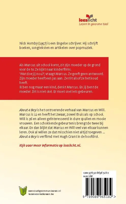 In dit grappige en ontroerende verhaal van Nick Hornby staat een jongen met autistische trekjes centraal. Voeg daar aan toe een licht-hysterische, depressieve, alleenstaande moeder en een eeuwige vrijgezel, en je hebt About a boy. Het boek is ook verfilmd, met Hugh Grant in een van de hoofdrollen.