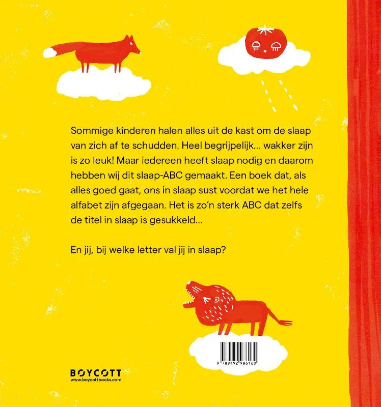 Dit boek is een gegarandeerd succes: wie bij de letter A nog wakker en alert is, zit bij de K al te knikkebollen, en later, bij de letter S, hoor je zacht gesnurk. En jij, bij welke letter val jij in slaap? Sommige kinderen halen alles uit de kast om de slaap van zich af te schudden. Heel begrijpelijk… wakker zijn is zo leuk! Maar iedereen heeft slaap nodig en daarom hebben wij dit slaap-ABC gemaakt. Een boek dat, als alles goed gaat, ons in slaap sust voordat we het hele alfabet zijn afgegaan. Het is zo’n sterk ABC dat zelfs de titel in slaap is gesukkeld…
