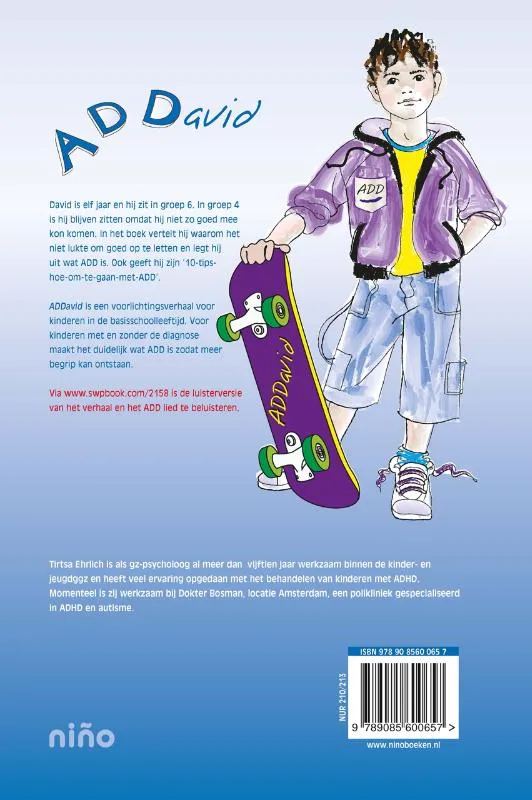 ADDavid is een voorlichtingsverhaal voor kinderen in de basisschoolleeftijd. Voor kinderen met en zonder de diagnose maakt het duidelijk wat ADD is zodat meer begrip kan ontstaan.