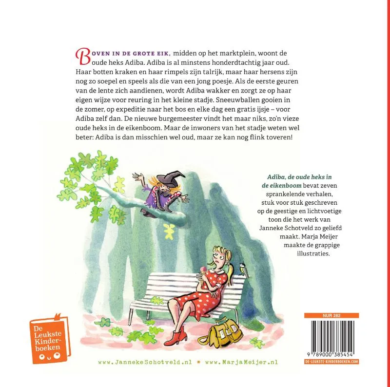 Boven in de grote eik, midden op het marktplein, woont de oude heks Adiba. Adiba is al minstens honderdtachtig jaar oud. Haar botten kraken en haar rimpels zijn talrijk, maar haar hersens zijn nog zo soepel en speels als die van een jong poesje. Als de eerste geuren van de lente zich aandienen, wordt Adiba wakker en zorgt ze op haar eigen wijze voor reuring in het kleine stadje. Sneeuwballen gooien in de zomer, op expeditie naar het bos en elke dag een gratis ijsje – voor Adiba zelf dan. De nieuwe burgemeester vindt het maar niks, zo’n vieze oude heks in de eikenboom. Maar de inwoners van het stadje weten wel beter: Adiba is dan misschien wel oud, maar ze kan nog flink toveren!