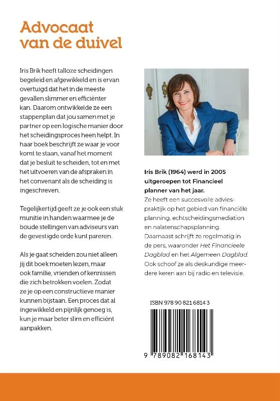 Iris Brik heeft talloze scheidingen begeleid en afgewikkeld en is ervan overtuigd dat het in de meeste gevallen slimmer en efficiënter kan. Daarom ontwikkelde ze een stappenplan dat jou samen met je partner op een logische manier door het scheidingsproces heen helpt. In haar boek beschrijft ze waar je voor komt te staan, vanaf het moment dat je besluit te scheiden, tot en met het uitvoeren van de afspraken in het convenant als de scheiding is ingeschreven.