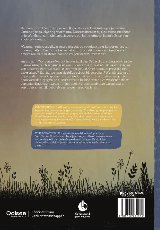 De ouders van Oscar zijn pas uit elkaar. Oscar is best trots op zijn nieuwe kamer bij papa. Maar hij mist mama. Daarom spreekt hij elke avond met haar af in Wonderland. In die fantasiewereld vol herinneringen beleeft Oscar een knotsgek avontuur. Wanneer ouders uit elkaar gaan, zijn ook de gevolgen voor kinderen niet te onderschatten. Daarom is het zo belangrijk om dit onderwerp met hen te bespreken en te luisteren naar de vragen waar zij mee zitten. Afspraak in Wonderland vertelt het verhaal van Oscar die zijn weg zoekt in de nieuwe situatie. Daarnaast is er een uitgebreid informatief luik waarin vragen van kinderen centraal staan. Is het mijn schuld? Ziet mama of papa mij niet meer graag? Kan ik nog naar dezelfde school blijven gaan? Wat als mama of papa verliefd wordt op iemand anders? Om deze en vele andere vragen te beantwoorden, gingen de auteurs te rade bij kinderen en volwassenen die zelf een scheiding meemaakten. In het boek worden handvaten aangereikt om een open en eerlijk gesprek aan te gaan met kinderen.