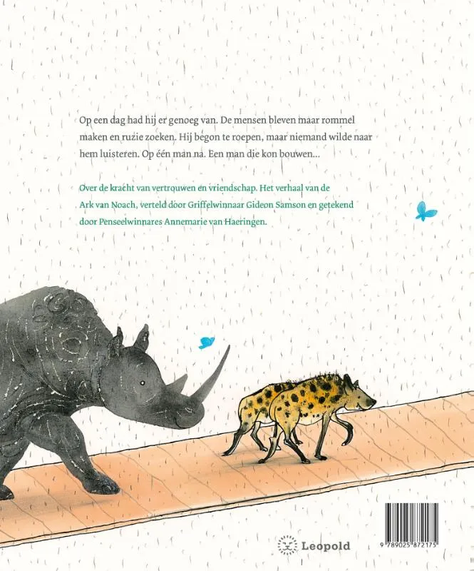 Poëtische bewerking van het verhaal van de ark van Noah, verteld door Griffelwinnaar Gideon Samson en getekend door Penseelwinnares Annemarie van Haeringen.
