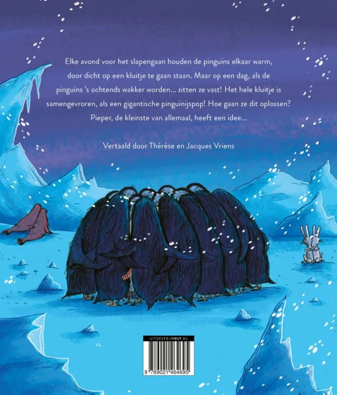 Elke avond voor het slapengaan houden de pinguïns elkaar warm, door dicht op een kluitje te gaan staan. Maar op een dag, als de pinguïns ’s ochtends wakker worden… zitten ze vast! Het hele kluitje is samengevroren, als een gigantische pinguïnijspop!