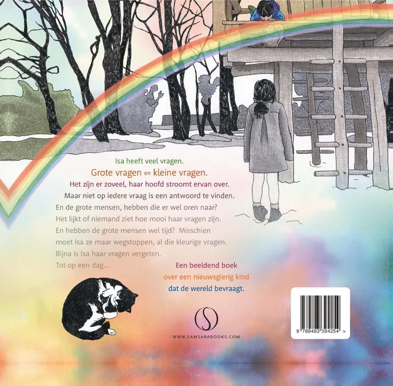 Isa heeft veel vragen. Grote vragen en kleine vragen. Het zijn er zo veel, haar hoofd stroomt ervan over. Maar niet op iedere vraag is een antwoord te vinden. En de grote mensen, hebben die er wel oren naar? Hebben ze wel tijd? Het lijkt alsof niemand ziet hoe mooi haar vragen zijn. Misschien moet ze ze maar wegstoppen, al die kleurige vragen. Bijna is lsa haar vragen vergeten. Tot op een dag…