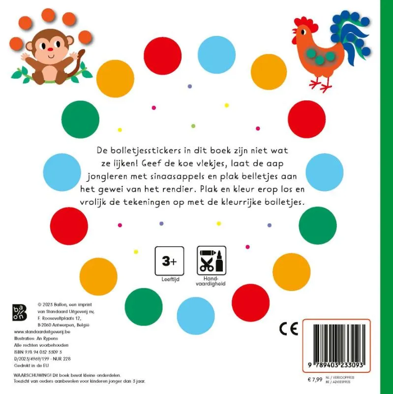De bolletjesstickers in dit boek zijn niet wat ze lijken! Geef de koe vlekjes, laat de aap jongleren met sinaasappels en plak belletjes aan het gewei van het rendier. Plak en kleur erop los en vrolijk de tekeningen op met kleurrijke bolletjes.