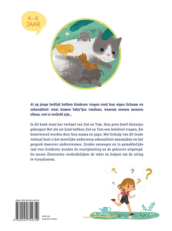 In dit boek staat het verhaal van Zoë en Tom. Hun poes heeft kleintjes gekregen! Net als uw kind hebben Zoë en Tom een heleboel vragen, die beantwoord worden door hun mama en papa. Met behulp van dit leuke verhaal kunt u het moeilijke onderwerp seksualiteit aansnijden en het gesprek daarover ondersteunen. Zonder omwegen en in gemakkelijke taal voor kinderen worden de voortplanting en de geboorte uitgelegd. De mooie illustraties verduidelijken de tekst en helpen om de uitleg te visualiseren.