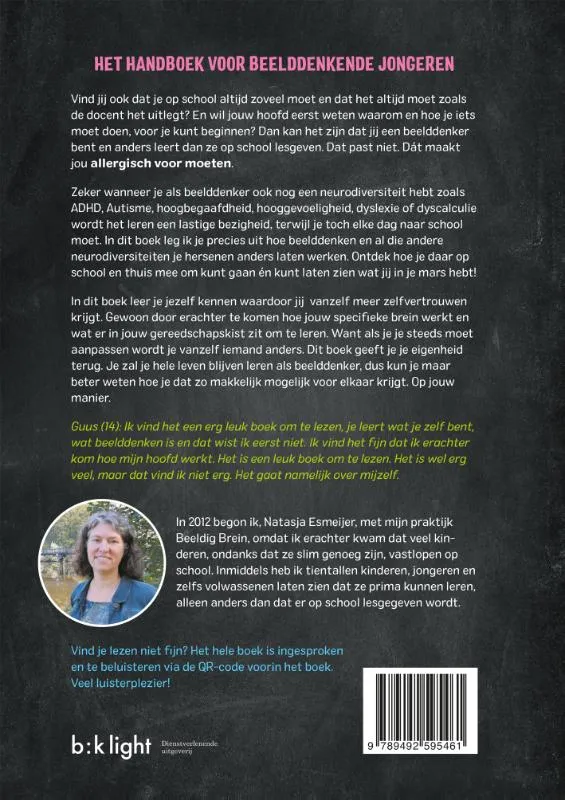 Zeker wanneer je als beelddenker ook nog een neurodiversiteit hebt zoals ADHD, Autisme, hoogbegaafdheid, hooggevoeligheid, dyslexie of dyscalculie wordt het leren een lastige bezigheid, terwijl je toch elke dag naar school moet. In dit boek leg ik je precies uit hoe beelddenken en al die andere neurodiversiteiten je hersenen anders laten werken. Ontdek hoe je daar op school en thuis mee om kunt gaan én kunt laten zien wat jij in je mars hebt!