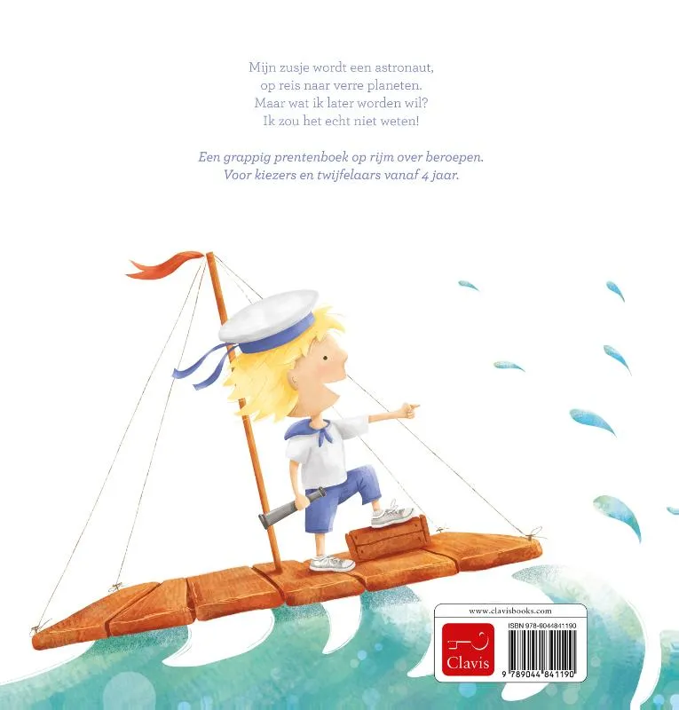 Een grappig prentenboek op rijm over beroepen. Voor kiezers en twijfelaars vanaf 4 jaar. Mijn zusje wordt een astronaut, op reis naar verre planeten. Maar wat ik later worden wil? Ik zou het echt niet weten!