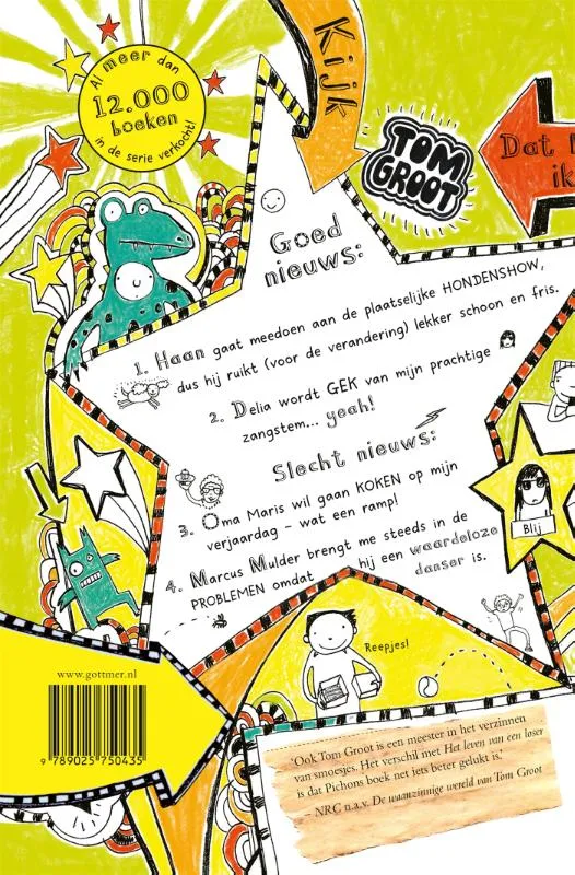 ‘School begint weer, maar dat is geen ramp. Er gaat genoeg leuks gebeuren. Haan gaat meedoen aan een hondenshow, de schooldisco komt eraan en ik ben bijna jarig. En het goede nieuws is dat Delia voor geen van deze dingen is uitgenodigd. Het enige wolkje aan de horizon is mijn verjaardag, want oma heeft beloofd dat ze zal gaan koken… uh-oh!’ Iedereen houdt van Tom Groot. Na het grote succes van ‘De waanzinnige wereld van Tom Groot’ en ‘Tom Groot – Goeie smoes’ is dit alweer zijn derde dagboek. Het staat vol met de bekende krabbels, tekeningen en doedels. In een vergelijking van Tom Groot met Kinneys ‘Het leven van een loser’ bestempelde NRC Handelsblad Pichons boek als ‘net iets beter gelukt’ – een oordeel waar Tom Groot zich helemaal in kan vinden!