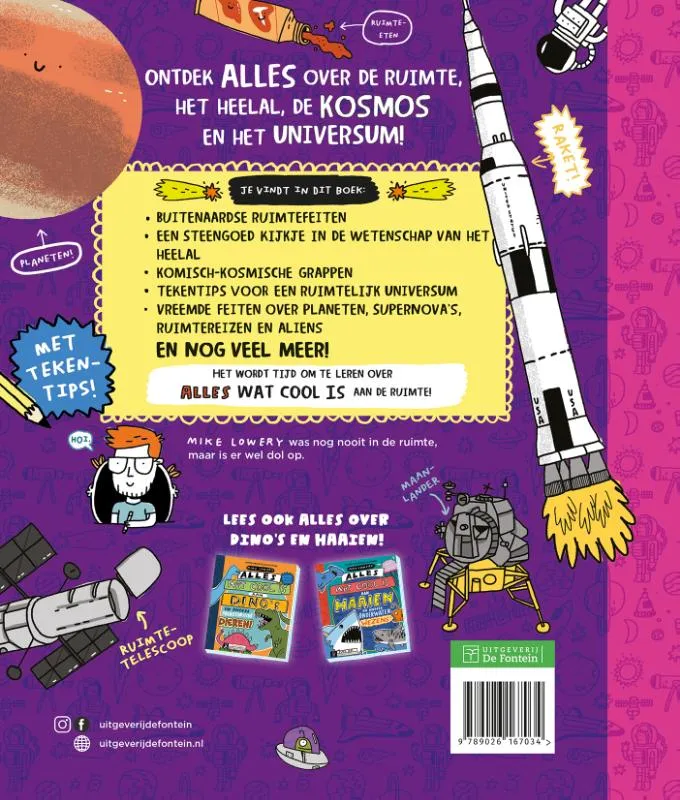 Ontdek alles over de ruimte, het heelal, de kosmos en het universum! Illustrator, grappenmaker en ruimtefanaat Mike Lowery is terug met het laatste deel in deze grappige trilogie barstensvol feiten voor nieuwsgierige heelalfans vanaf 7 jaar. Lees alles over de planeten, supernova’s, ruimtereizen, zwarte gaten en het sterkste diertje in de ruimte.