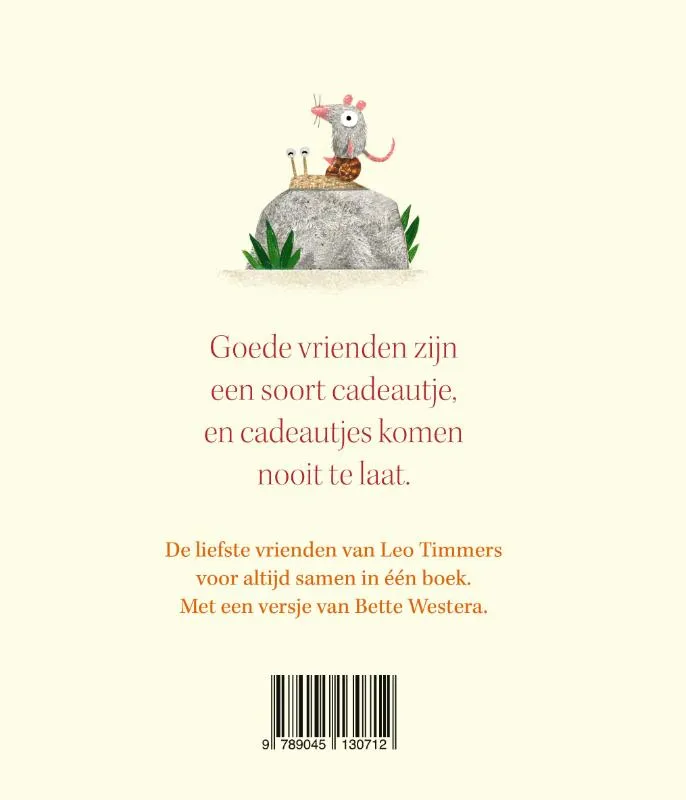 In de boeken van Leo Timmers is vriendschap een belangrijk thema. Dit kartonboek is een verzameling van de liefste vrienden uit zijn werk: Eiland van Olifant, Aap op straat, Boem en vele anderen. De grappigste en warmste duo’s worden bezongen door meervoudig Gouden Griffel- en Gouden Poëziemedaillewinnaar Bette Westera. Zij schreef bij deze beelden een gloednieuw versje.