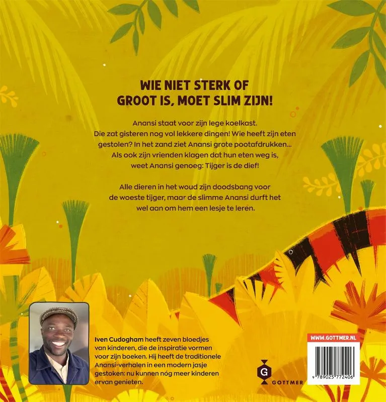 De vrolijke tekst van voormalig AT5-kinderpresentator Iven Cudogham, die net als Anansi vader is van 7 kinderen, neemt iedereen in voor de slimme maar ondeugende spin. De warme illustraties van Moldybyrd Studio maken van ‘Anansi de spin en de gulzige tijger’ een onmisbare titel.