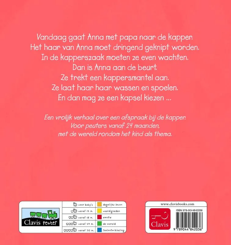 Vandaag gaat Anna met papa naar de kapper. Het haar van Anna moet dringend geknipt worden. In de kapperszaak moeten ze even wachten. Dan is Anna aan de beurt. Ze trekt een kappersmantel aan. Ze laat haar haar wassen en spoelen. En dan mag ze een kapsel kiezen …
