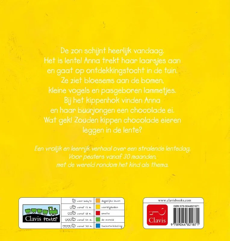 De zon schijnt heerlijk vandaag. Het is lente! Anna trekt haar laarsjes aan en gaat op ontdekkingstocht in de tuin. Ze ziet bloesems aan de bomen, kleine vogels en pasgeboren lammetjes. Bij het kippenhok vinden Anna en haar buurjongen een chocolade ei. Wat gek! Zouden kippen chocolade-eieren leggen in de lente?