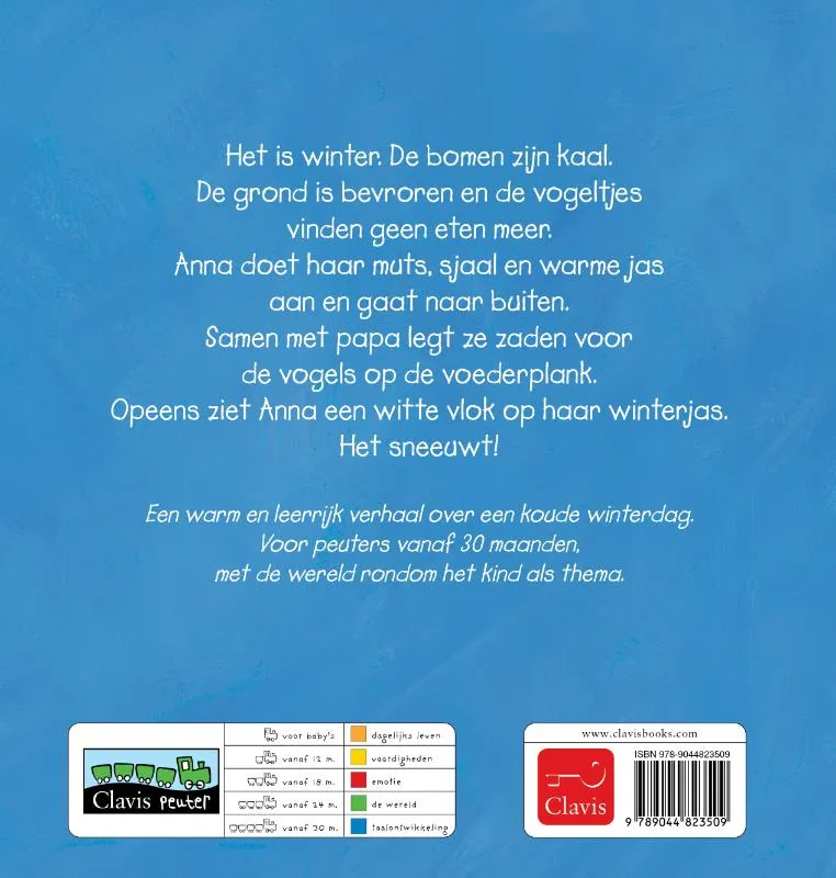 Het is winter. De bomen zijn kaal. De grond is bevroren en de vogeltjes vinden geen eten meer. Anna doet haar muts, sjaal en warme jas aan en gaat naar buiten. Samen met papa legt ze zaden voor de vogels op de voederplank. Opeens ziet Anna een witte vlok op haar winterjasje. Het sneeuwt!