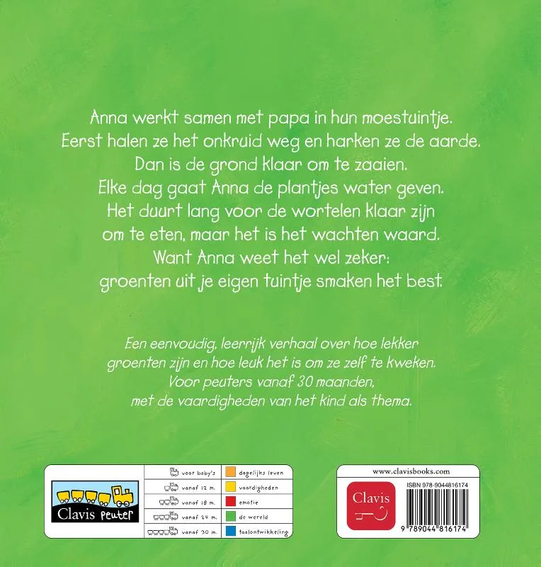 Anna maakt met papa een eigen moestuintje.Ze gaan er zelf wortelen en sla kweken. Anna is dol op groenten en vindt het heerlijk om te helpen. Onkruid wieden, harken, zaaien, water geven En dan geduldig wachten tot de groenten groeien. Want Anna weet het wel zeker: verse groenten uit je eigen tuin smaken echt heerlijk.