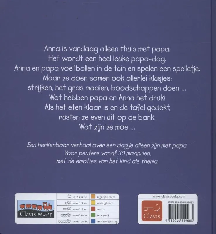 Anna is vandaag alleen thuis met papa. Het wordt een superleuke papa-dag. Anna en papa voetballen in de tuin en spelen een spelletje. Maar ze doen samen ook allerlei klusjes: strijken, het gras maaien, boodschappen doen … Wat hebben papa en Anna het druk! Als het eten klaar is en de tafel gedekt, rusten ze even uit op de bank. Wat zijn ze moe …