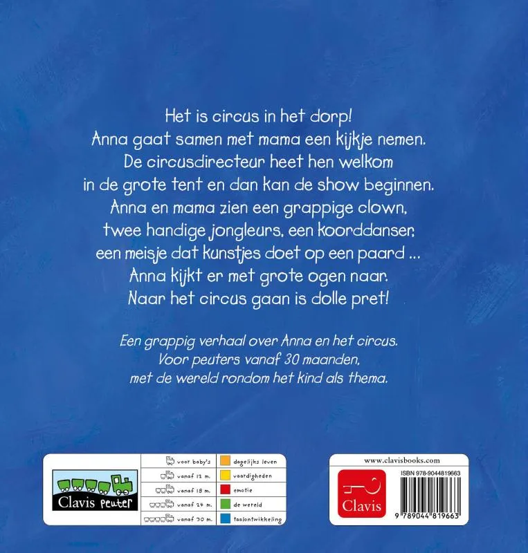 Het is circus in het dorp! Anna gaat samen met mama een kijkje nemen. De circusdirecteur heet hen welkom in de grote tent en dan kan de show beginnen. Anna en mama zien een grappige clown, twee handige jongleurs, een koorddanser, een meisje dat kunstjes doet op een paard … Anna kijkt er met grote ogen naar. Naar het circus gaan is dolle pret!