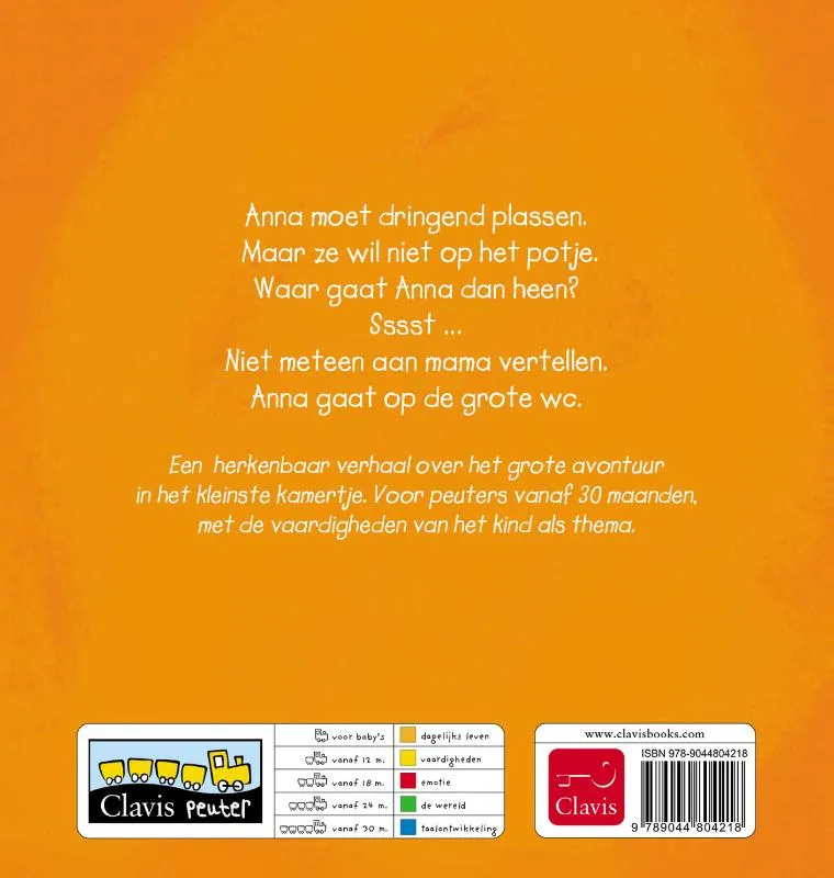 Anna moet dringend plassen. Maar ze wil niet op het potje. Waar gaat Anna dan heen? Sssst … Niet meteen aan mama vertellen. Anna gaat op de grote wc.