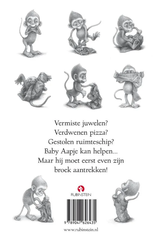 Dit uitermate grappige boek is een combinatie van een prentenboek, een leren lezen boek en een graphic novel. Het telt 192 bladzijden en toch is het bedoeld voor kinderen van 4 tot 8 jaar oud. Er zijn juwelen gestolen, een pizza is zoek, een ruimteschip verdwenen… Baby Aapje kan helpen, maar hij moet eerst even zijn broek aantrekken. Vijf verhalen in een bizar leuke bundel.