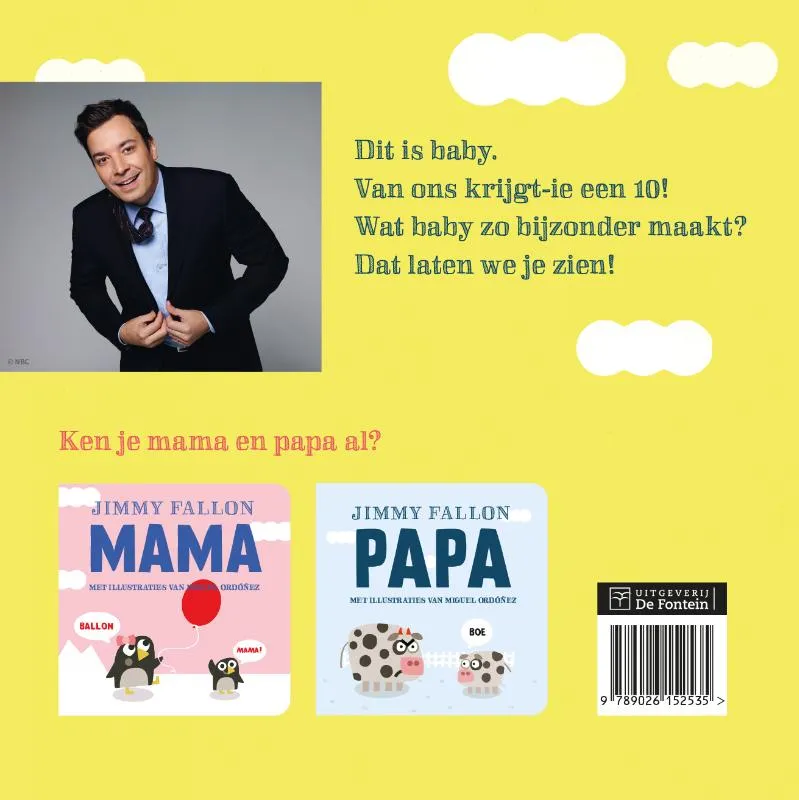 Baby is het derde humoristische ‘eerste woordjes’-boek van de beroemde komiek Jimmy Fallon, geïllustreerd door Miguel Ordóñez. Deze New York Times-bestsellerserie is het perfecte kraamcadeau.<br><br>Na het oefenen van de woorden ‘papa’ en ‘mama’ in de gelijknamige boeken wordt het nu tijd voor dreumesen om te leren hun lichaamsdelen te benoemen met het boek Baby.<br>Baby heeft ogen, een neus, vingers en tenen… Maar wat is het belángrijkste deel van het lichaam?