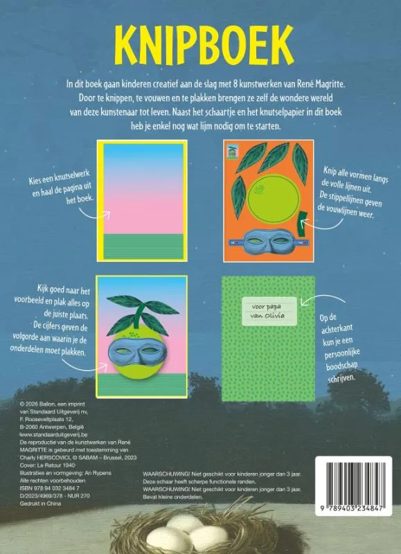 In dit boek gaan kinderen creatief aan de slag met 8 kunstwerken van René Magritte. Door te knippen, te vouwen en te plakken brengen ze zelf de wondere wereld van deze kunstenaar tot leven. Naast het schaartje en het knutselpapier in dit boek heb je enkel nog wat lijm nodig om te starten.