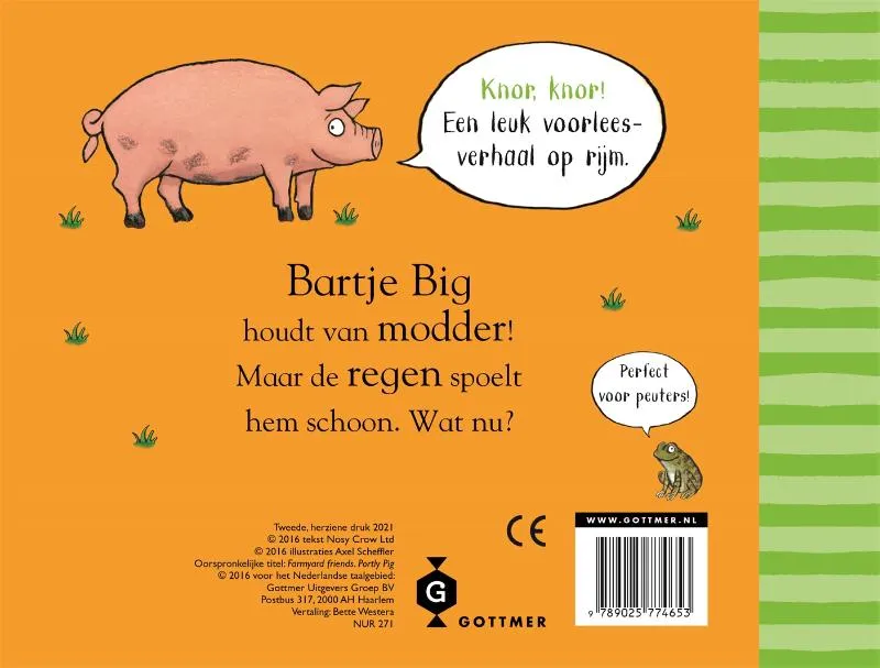 Bartje Big doet niets liever dan rollen in de grootste modderpoelen. Maar dan spoelt de regen het varken weer helemaal schoon en roze. Wat nu? ‘Bartje Big’ is gelijk herkenbaar als een peuterboek van Axel Scheffler. Zijn illustraties zijn niet meer weg te denken. In deze mooi, stevige uitvoering als kartonboek komen ze prachtig tot hun recht. De vertaling op rijm is van Bette Westera.