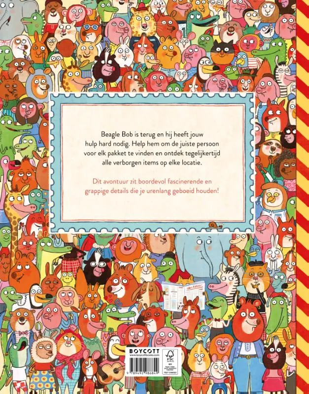 Beagle Bob is pakketbezorger. Kun jij hem in de zoekplaten helpen om zijn pakjes op de goede plek te krijgen? En kan je de verborgen objecten vinden? Prentenboek met drukke illustraties in kleur. Vanaf ca. 4 jaar.