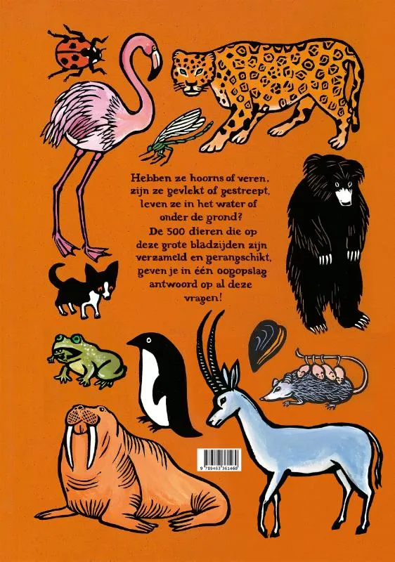 Prachtig, gebonden prentenboek op groot formaat met een verzameling van meer dan 400 bekende en minder bekende dieren, op originele wijze ingedeeld op leefomgeving, kleur, soort of grootte.
