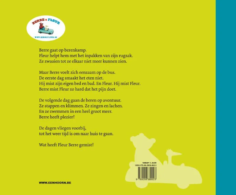 Berre gaat op berenkamp. Hij pakt zijn rugzak in. Fleur stopt er stiekem een knuffel bij. Berre voelt zich eenzaam op de bus. De eerste dag smaakt het eten hem niet. De volgende dag gaan de beren op avontuur. Ze zwemmen in het meer en picknicken. Berre amuseert zich. De tijd vliegt voorbij … Over de eerste keer op kamp gaan, heimwee en loslaten.