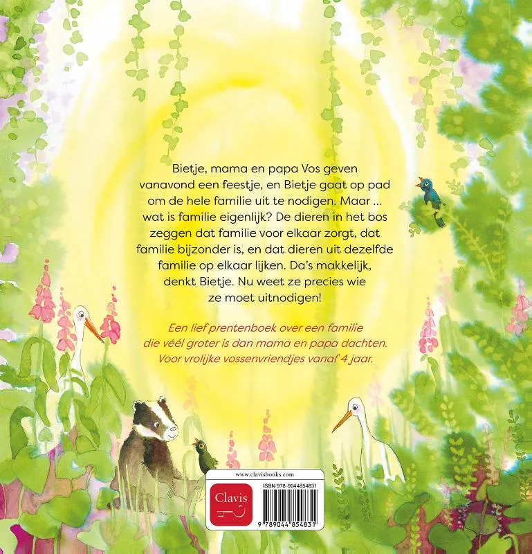 Bietje, mama en papa Vos geven vanavond een feestje, en Bietje gaat op pad om de hele familie uit te nodigen. Maar … wat is familie eigenlijk? De dieren in het bos zeggen dat familie voor elkaar zorgt, dat familie bijzonder is, en dat dieren uit dezelfde familie op elkaar lijken. Da’s makkelijk, denkt Bietje. Nu weet ze precies wie ze moet uitnodigen!
